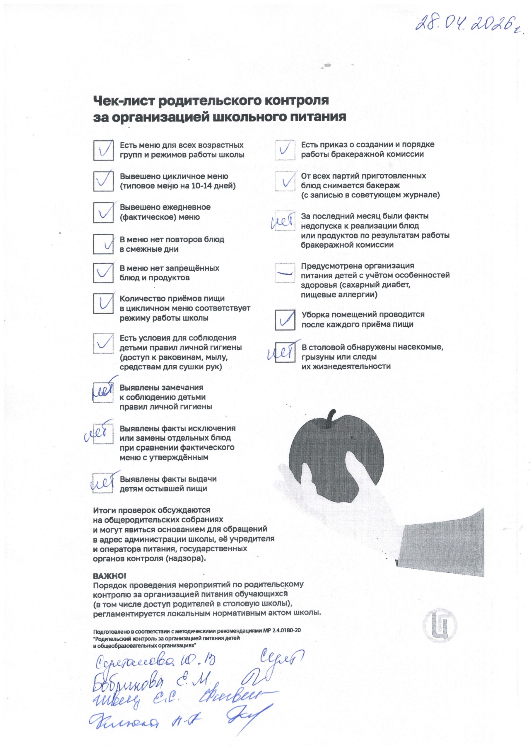 Ознакомьтесь с чек-листом родительского контроля за организацией школьного питания от 28.04.2026